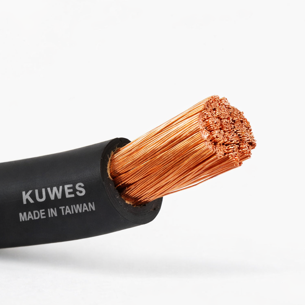 Purchase KUWES welding cable in UAE, featuring pure copper conductors and black single rubber insulation for superior safety and conductivity. Available in sizes 25, 35, 50, 70, and 95 sq.mm with a standard length of 80 meters, this cable is perfect for industrial, marine, shipyard, and fabrication welding projects. Manufactured in Taiwan, it delivers durable, reliable, and heavy-duty performance for professional welding operations, ensuring efficient current flow and long-lasting use.