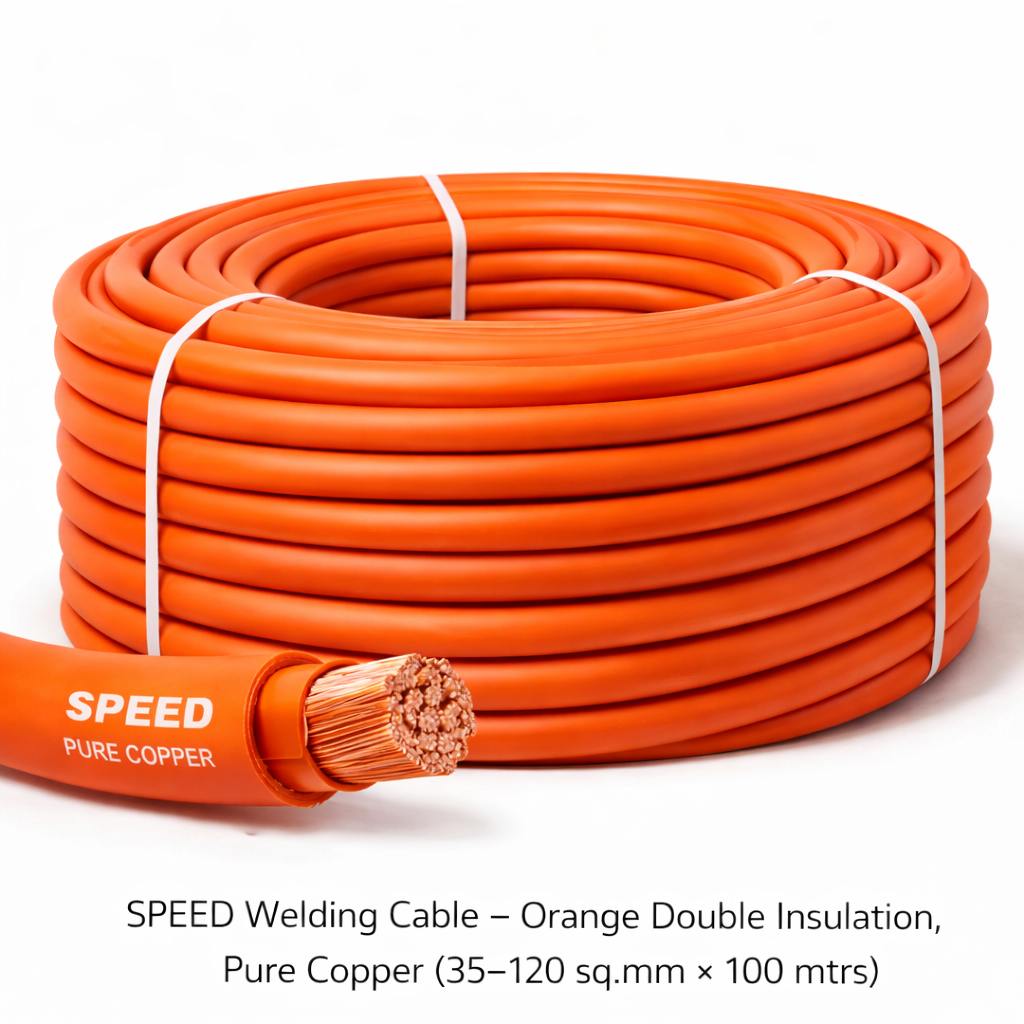 Buy Speed welding cable in UAE, featuring pure copper conductors and orange double insulation for maximum safety and heavy-duty performance. Available in sizes 35, 50, 70, 95, and 120 sq.mm with a standard length of 100 meters, this cable is ideal for marine, industrial, shipyard, and fabrication welding projects. Made in India, it ensures durable, reliable, and efficient current flow, providing professional welders with long-lasting, high-performance welding solutions.